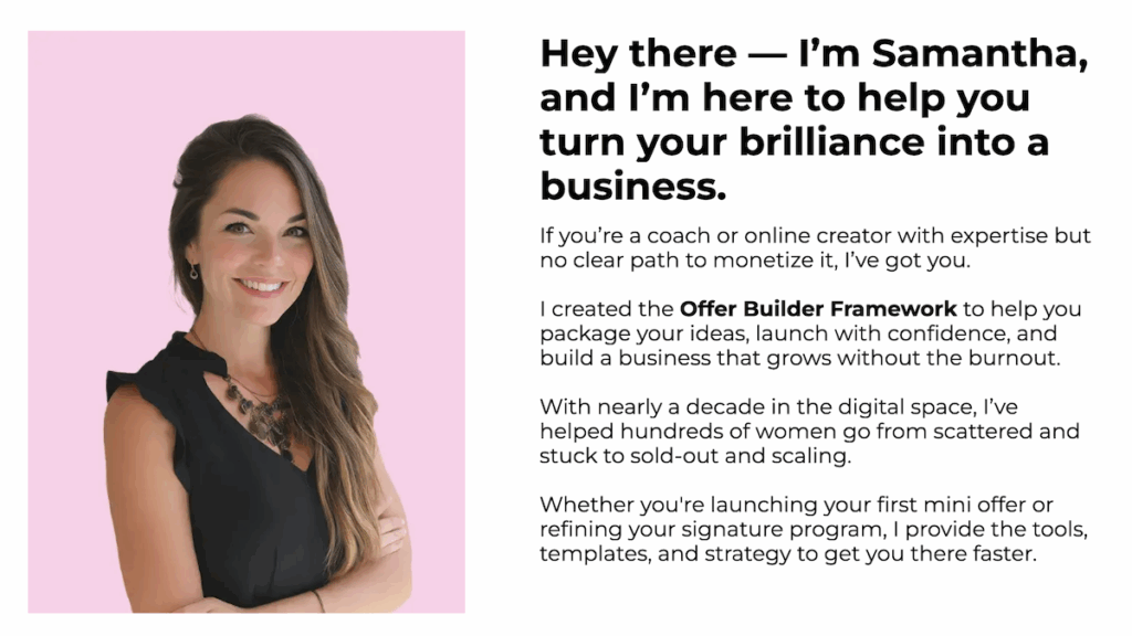 This product suite leads with a section for a video sales letter from the coach. Never made a VSL? No worries! Head on over to Copy Packs to create a script perfect for YOU and your offers!